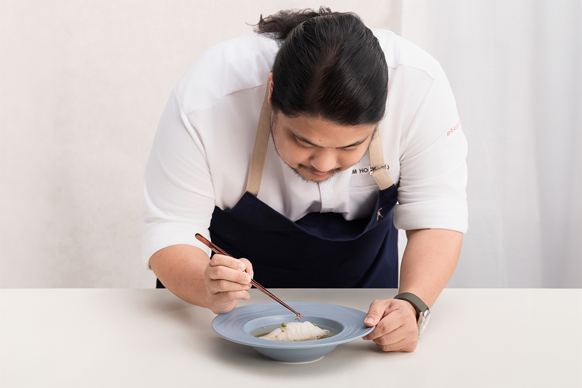 史金福(Kim Hock Su)主廚,擅長將歐陸烹飪技法與區域風物巧妙共鳴,帶著英國White Hart及 The Freemason等地磨鍊的實力,於食藝界掀起一場靜默卻深遠的變革。他隨後在台灣等地拓展事業版圖,返鄉後創立「Restaurant au Jardin」,逾八成食材皆來自方圓二十公里內,以法式手法詮釋四時變化與土地印記。