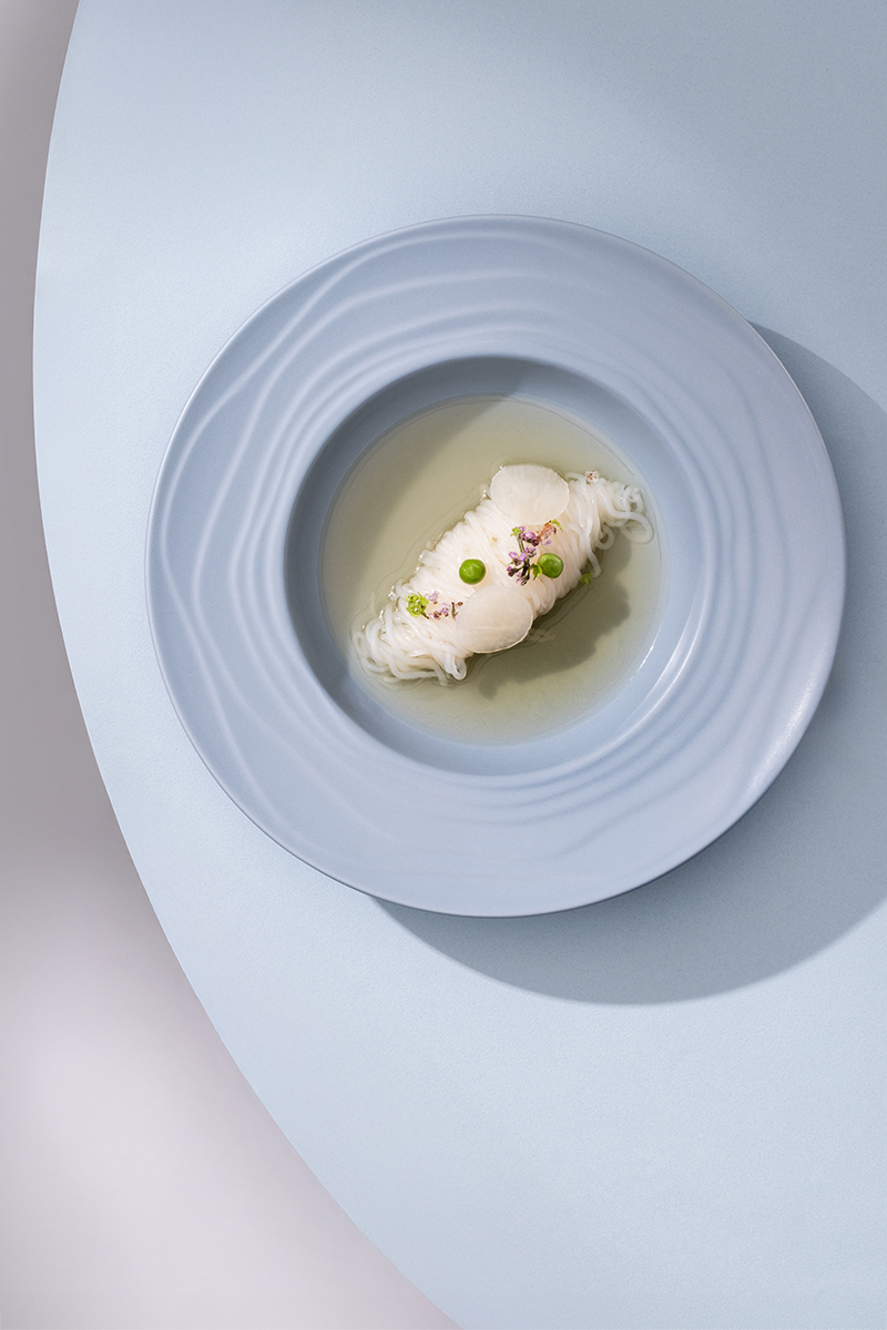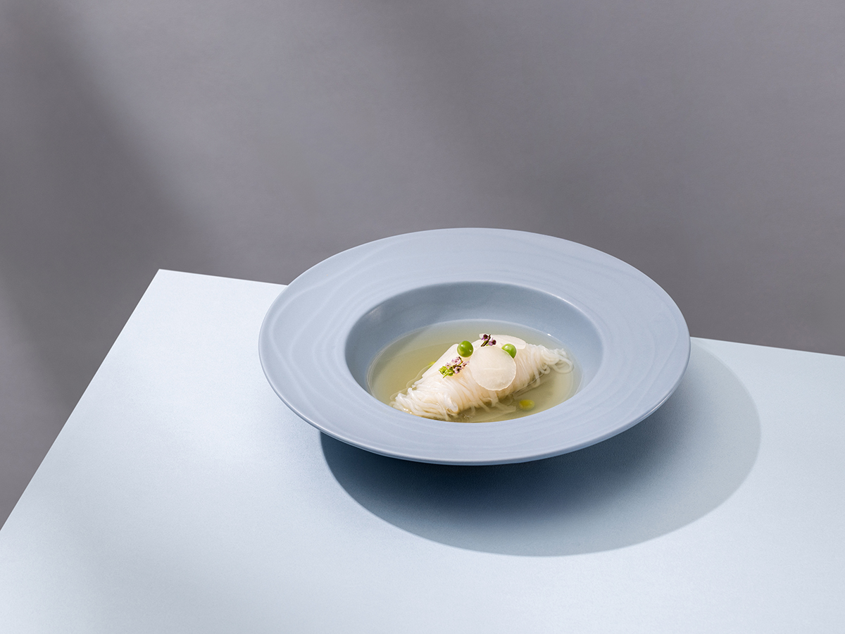 在「Restaurant au Jardin」,每份料理皆蘊藏主廚家鄉的溫情。他以兒時經歷為啟發,凝鍊出標誌性佳餚──「野薑澄雞湯佐春雨蒟蒻」。煙波限定版本改以台灣放山雞為底,加入老薑、嫩薑與薑黃慢燉,湯汁清澈,辛香中帶柔雅。久煮的蘿蔔溢發自然清甜,搭配滑順的蒟蒻春雨,為整體添上輕盈節奏。