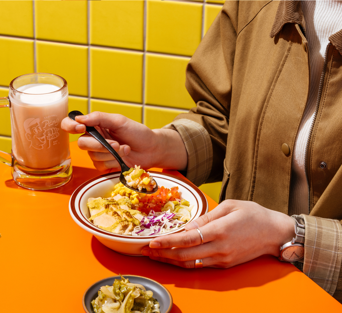 Pang Taco 胖塔可主廚推出限定版「墨式嫩雞能量碗」,以香料飯鋪底,煙燻紅椒帶出的溫厚氣息如暖流般緩緩甦醒味蕾。