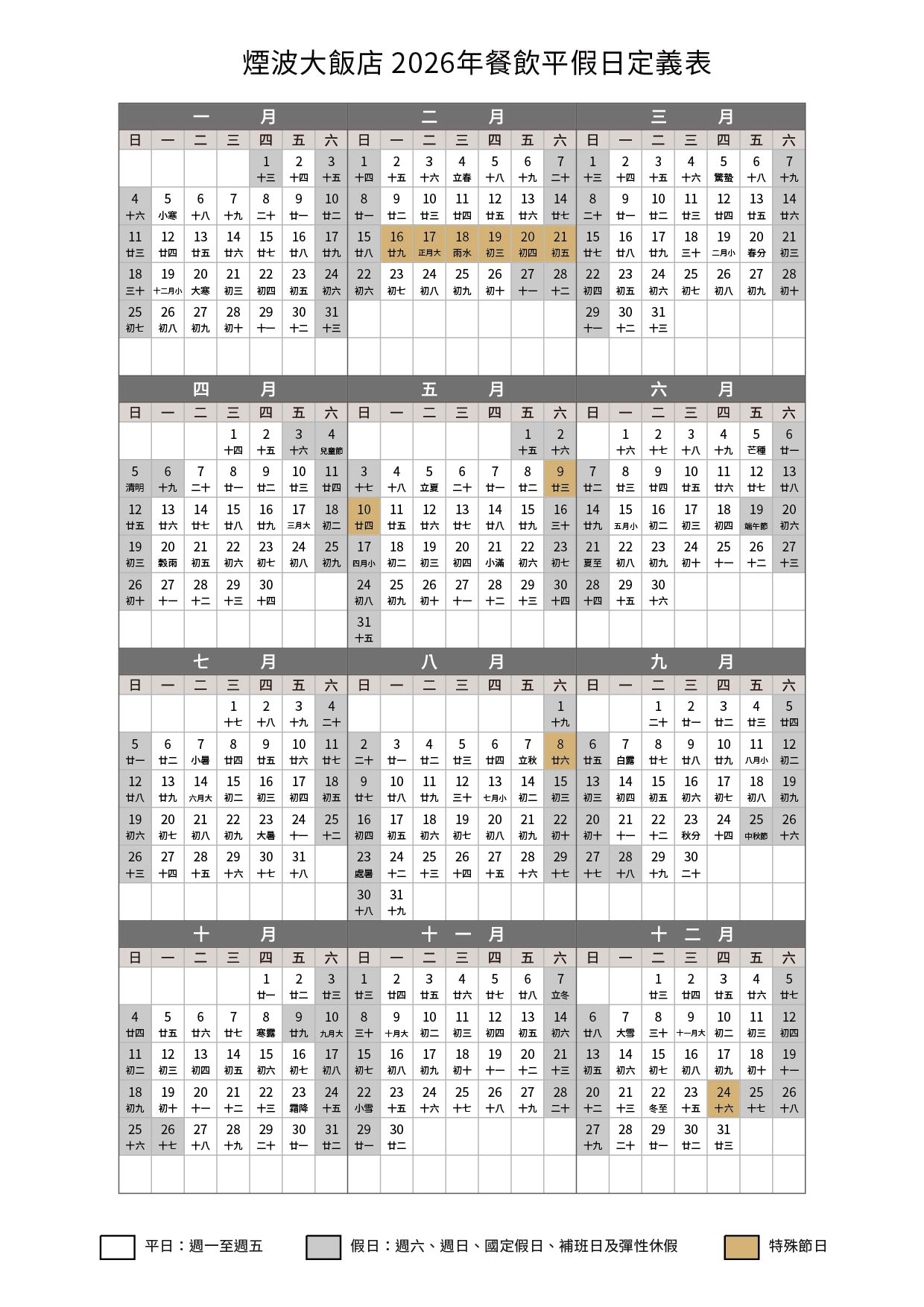 客房餐飲行事曆 - 2026年|餐飲平假日定義表