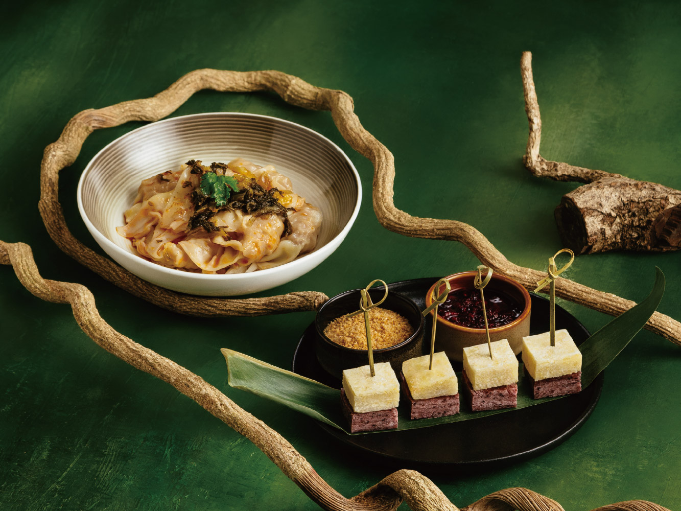 馬告經烘烤研磨後,釋放木質檸香,與蒜苗清香相融於雞高湯,襯托魚中之王「鱘龍魚」的鮮嫩細膩;湯頭清澈、清甜不膩,微辛尾韻在舌尖回旋,純粹自然。
