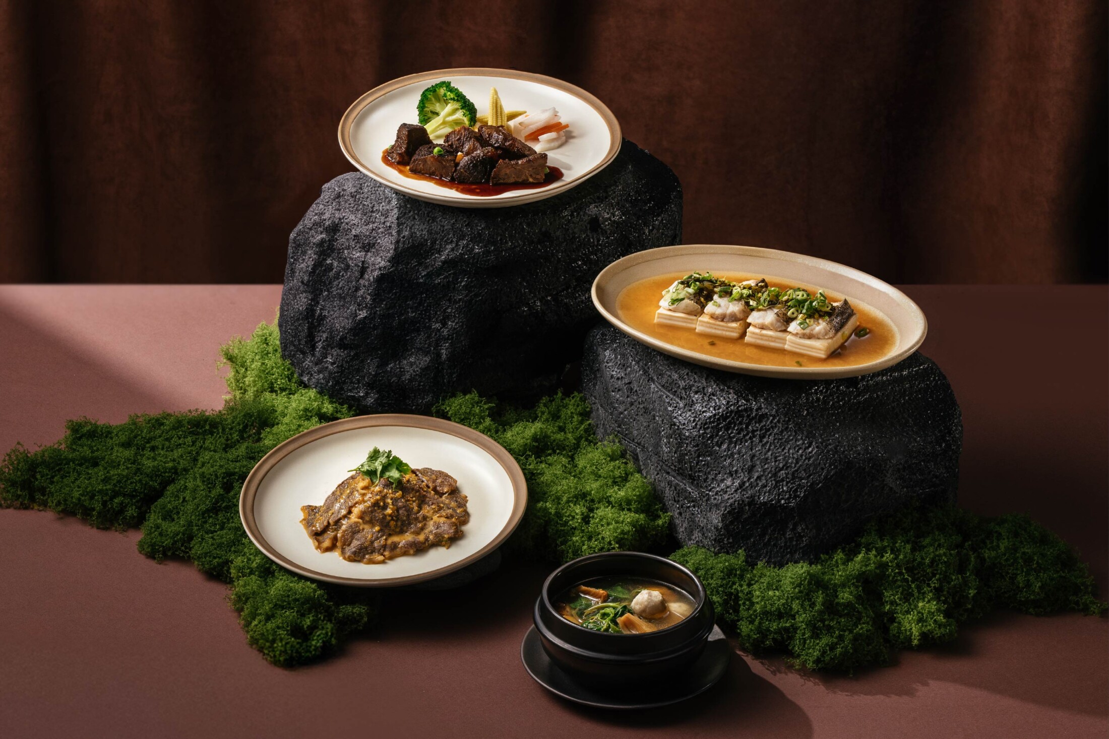 細嫩龍虎斑鋪於白嫩豆腐上蒸製,魚汁與豆香在蒸氣中緩緩交融,口感柔潤細緻,搭配新城酸菜自然發酵的清亮酸香,結合蕃茄絲的微甜與肉絲鹹香,層層滲入湯汁之中,酸、鮮、甜交織而成,風味清雅通透,細膩而富有層次。