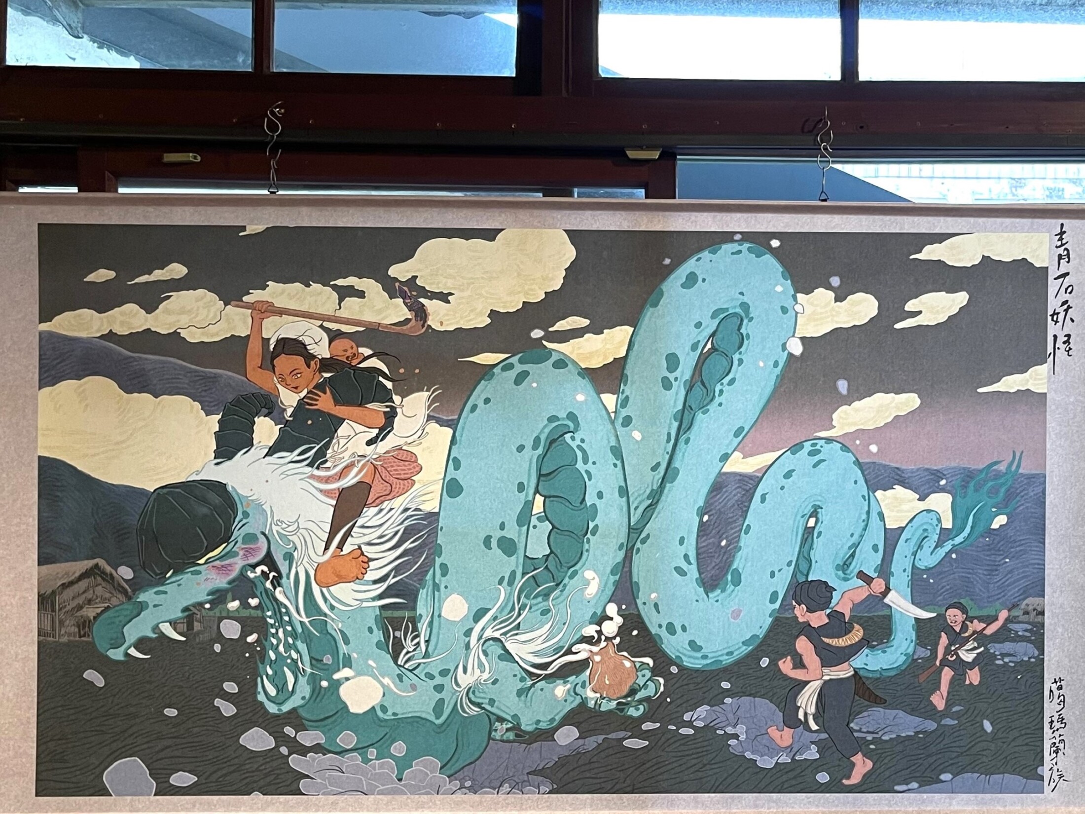 角斯筆下的戾龍Kangic是花蓮山林間的靈性象徵,他以濃烈色彩和流動線條描繪自然力量,提醒人們在信仰與自然面前保持敬畏。